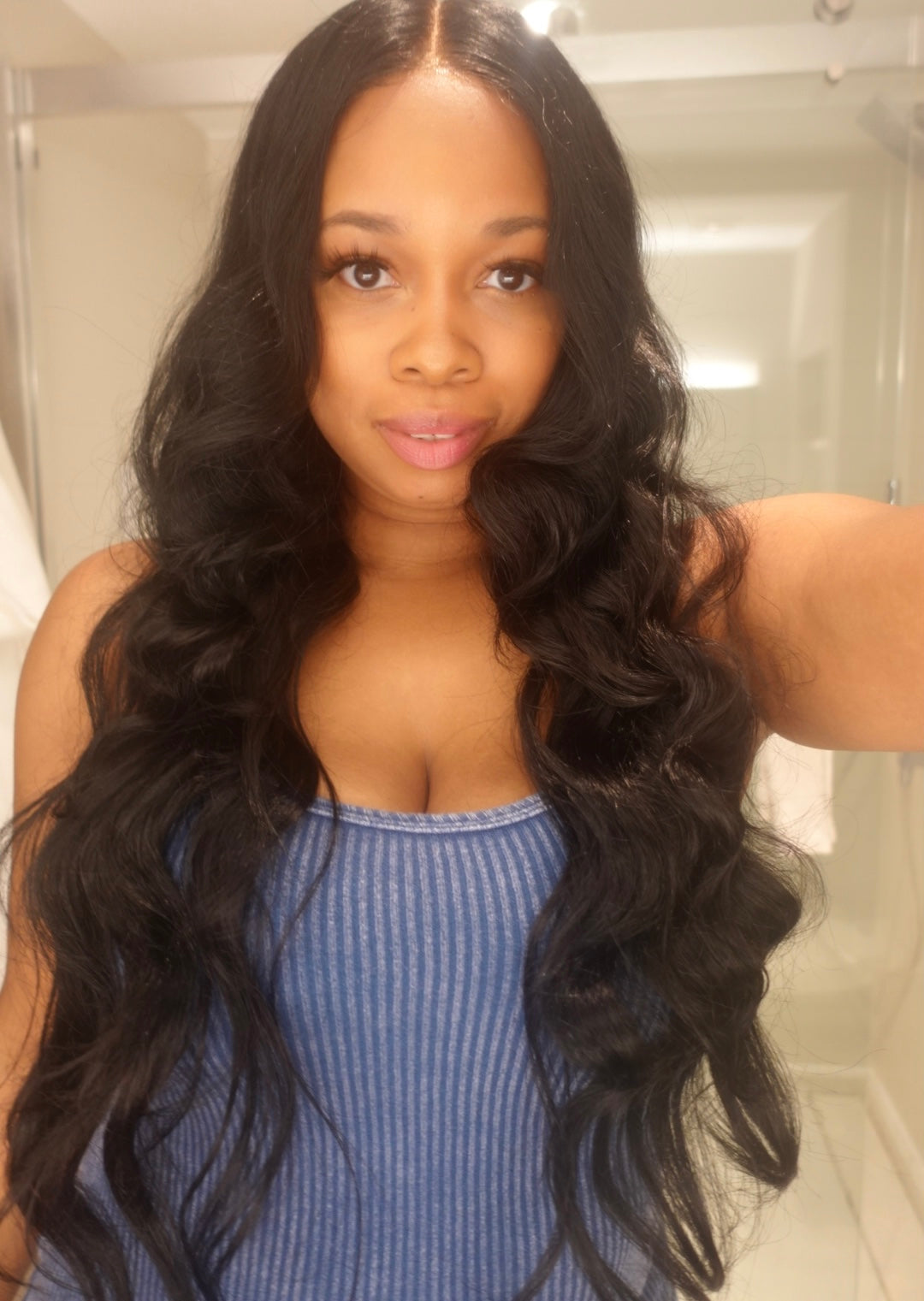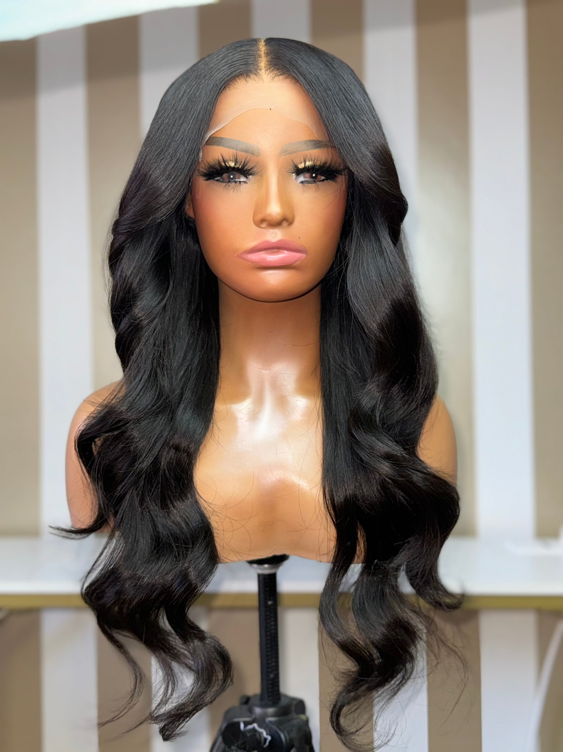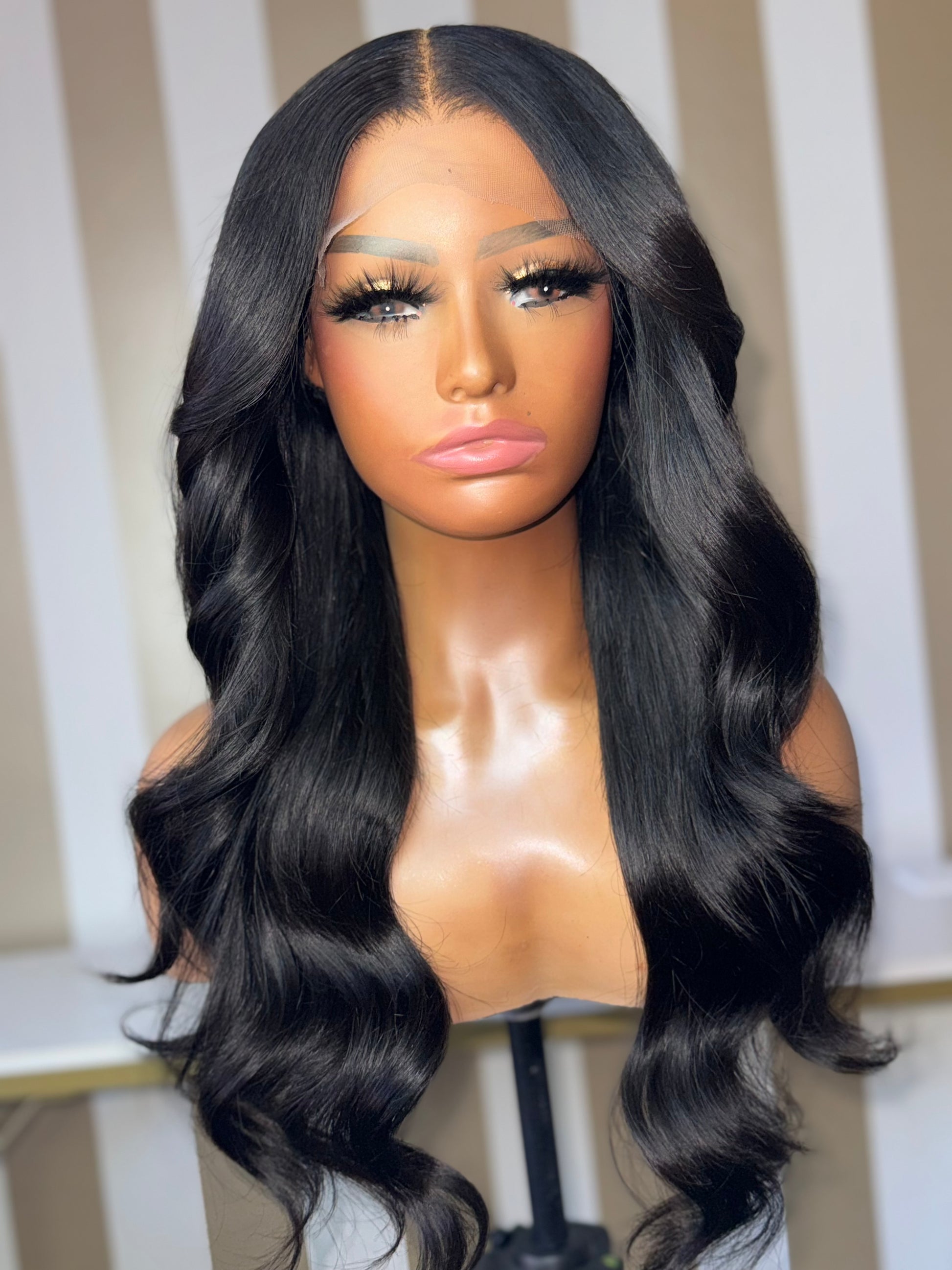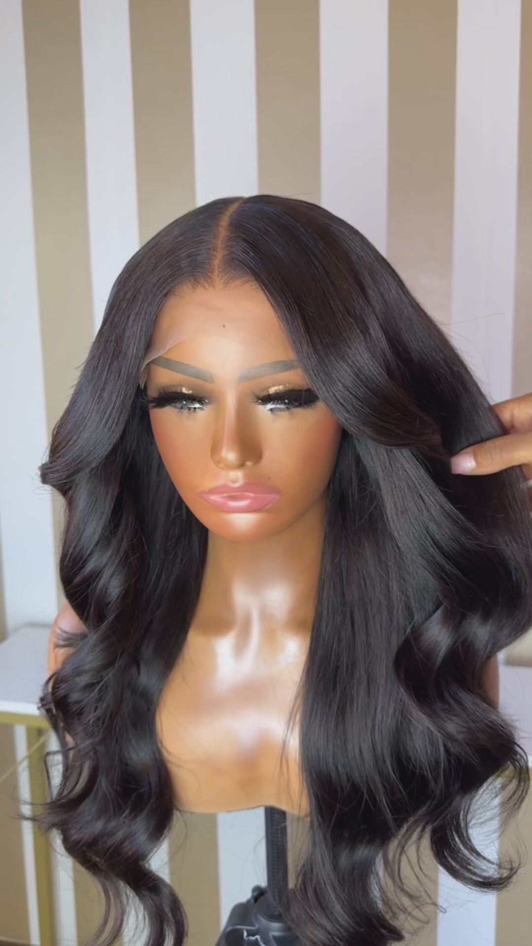 Our Glueless Wig in Natural Black (1B) offers a seamless blend of beauty and convenience. Made with 4 bundles of Brazilian body wave raw premium-quality bundles, this wig is machine-sewn and carefully crafted for durability and natural movement. It features light layering to add dimension and volume, creating a flattering silhouette.